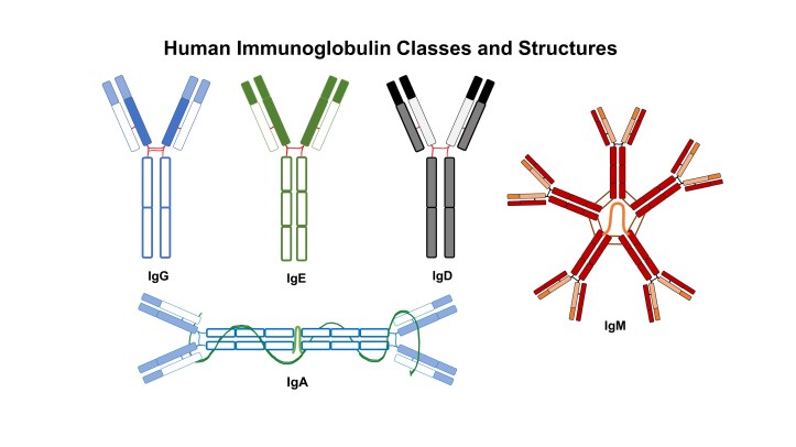 IgM can trace its roots all the way back to cartilaginous fishes making it the immunoglobulin with the longest evolutionary history. In addition to its presence in myriad animal taxa, it is the first immunoglobulin that responds when an antigen is present. Another primordial immunoglobulin is IgD. This immunoglobulin is still poorly understood, but the secreted form is known to bind to basophil surfaces and, overall, IgD is thought to enhance mucosal immunity. In humans, the most abundant immunoglobulin is IgG (accounting for ~75% of our serum antibodies) which is the only human antibody that can cross the placental barrier to confer immunity to newborn babies–an essential role. While IgA plays a crucial role in mucosal immunity, IgE is critical for defense against parasites, and is also involved in the dreaded allergic responses. IgE is specific to mammals and is the least abundant immunoglobulin in humans.