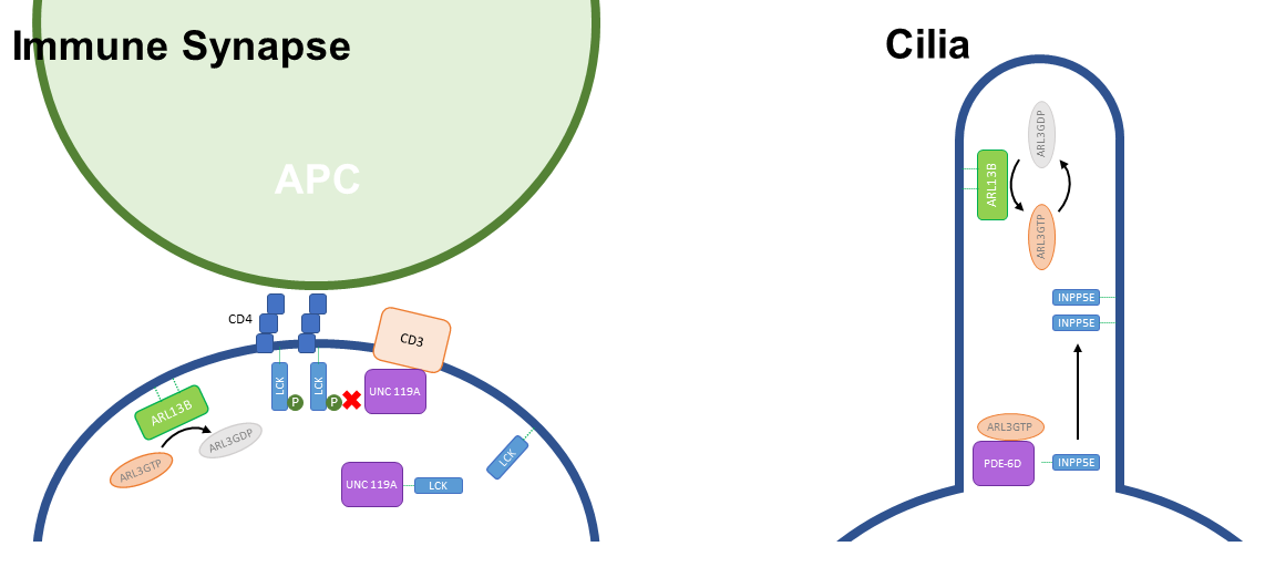 To figure out how LCK is released from UNC119A, researchers looked at another ciliary protein, ARL3. The active form of ARL3 is ARL3-GTP, which localizes to the immune synapse. They found that ARL3-GTP disrupts the binding of LCK to UNC119A by phosphorylating LCK, allowing LCK to complete its function and phosphorylate the TCR.