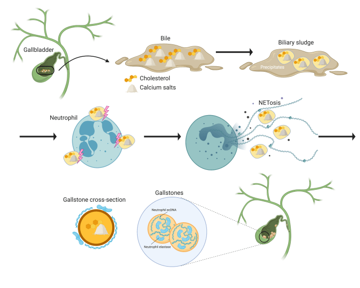 To investigate their hypothesis, the authors isolated and closely examined human gallstones. In addition to the typical cholesterol and calcium salts, extracellular DNA (ecDNA), as well as neutrophil elastase, were found on the gallstones’ surface. Both ecDNA and elastase (an enzyme that helps destroy pathogenic bacterial membranes) are known constituents of NETs. Their presence strongly argued for neutrophil involvement in gallstone development.