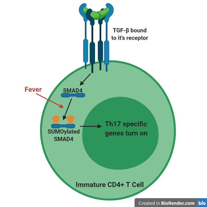 Overall, these studies discovered that fever increases the SUMOylation and activation of the SMAD4 transcription factor which causes increased Th17 cell populations to appear (Figure 2). The resulting increased Th17 cell populations contribute to more severe autoimmune disease in a mouse model of multiple sclerosis.