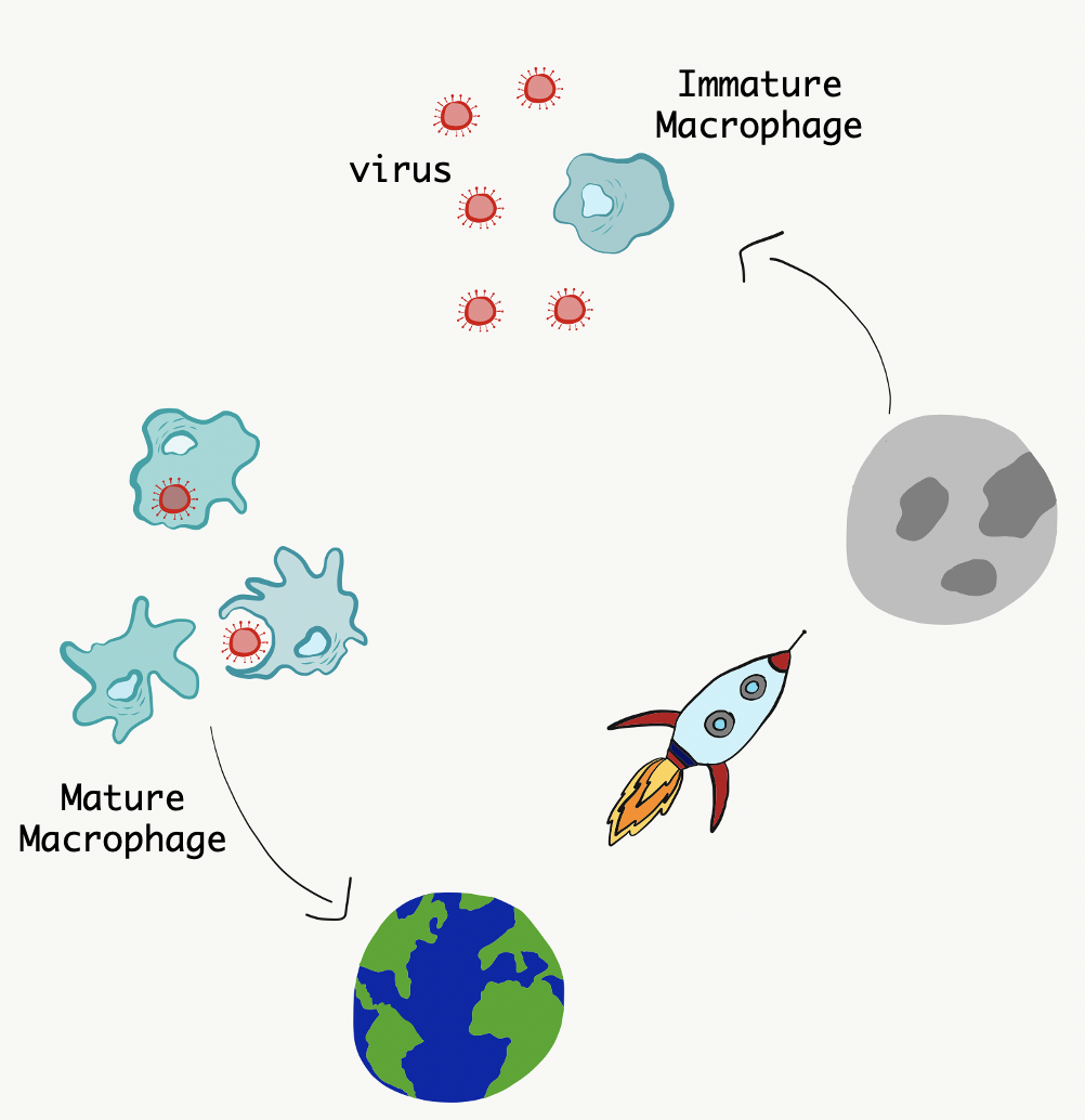 Macrophages are partially compromised due to spaceflight. The longer the duration of spaceflight, the less functional our macrophages seem to be. Studies indicate that macrophages are capable of surviving and functioning in low gravity. However, the process by which they differentiate, or mature from a less specialized cell to one distinct in form and function, seems to be more restricted than on Earth. Studies in Space and in simulations suggest that low gravity lays obstacles to several key steps of this “maturation” procedure. For instance, molecules guiding this process, such as the macrophage colony stimulating factor (M-CSF) and interleukins (IL) IL-3 and IL-6, were less potent in low gravity. This diminished macrophage maturation prevents the development of fully functional macrophages, thereby blunting the immune response to dangers like invading pathogens (Figure 1).