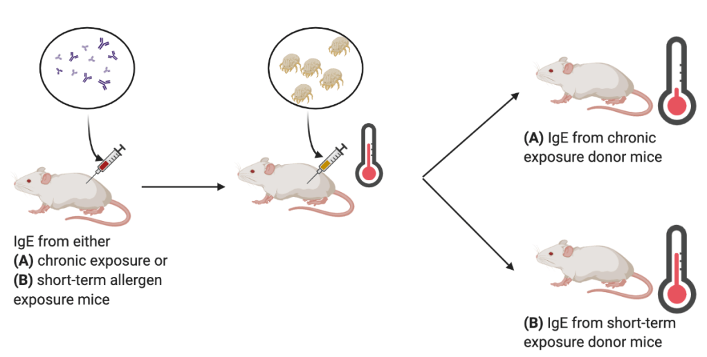 A severe allergic reaction may manifest as anaphylaxis, which is characterized by widespread inflammation, and a drop in body temperature. To investigate the effect of exposure duration on allergy severity, the researchers transferred allergen-specific IgE from the allergic mice into non-allergic mice via their blood (Figure. 3). These recipient mice were then challenged with the dust mite allergens via intravenous injection and their temperature was monitored over time as an indicator of anaphylaxis. They found that the IgE from mice with longer allergen exposure time induces a significantly larger temperature drop in recipient mice, even when the amount of IgE transferred is controlled. Therefore, the IgE’s produced during chronic allergen exposure elicit a stronger response against the specific allergen.