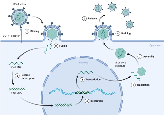 The routes of transmission are varied and include intercourse, use of contaminated needles, and transfer from mother to child. 80% of HIV-1 enters via the vagina or rectum through the mucosal membranes, which is why a large focus of HIV awareness campaigns are directed at sexual prevention. To access the bloodstream, the virus needs to pass through epithelial cells that line these membranes. There are a number of these epithelial cell layers in the vaginal and penile areas, but damage to these layers (e.g. during sex) can increase the viruses chances of transmission. However, in the rectum, this epithelial layer is only one cell thick; this means that there’s less of an external barrier to viral entry and explains why HIV infection tends to be more prominent among men and transgender women who sleep with men. Once in the bloodstream, the virus is free to infect CD4+ T cells, a type of white blood cell that plays a large part in the immune response. With its target in sight, the viral particles are able to bind to the host cell and fuse its encapsulating envelope with the membrane of the CD4+ T cell. This action facilitates the release of the virus’s genetic material into the cell, meaning that it can now take full advantage of the host cell’s machinery to make many more copies of itself (Figure 1).