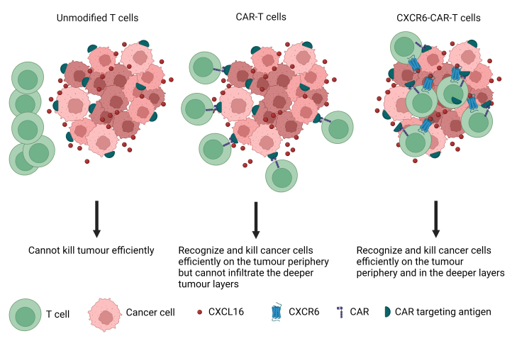 These factors represent one of the major obstacles for an otherwise promising cancer therapy known as chimeric antigen receptor T cell (CAR-T) cancer therapy. CAR is an engineered molecule, which consists of the recognition site for a particular tumor protein, as well as T cell components needed to initiate an immune response. CAR-T cells are highly efficient at killing tumor cells, but struggle to reach the deeper layers of solid tumors. That is where the researchers realized the chemokine system might come to help.
